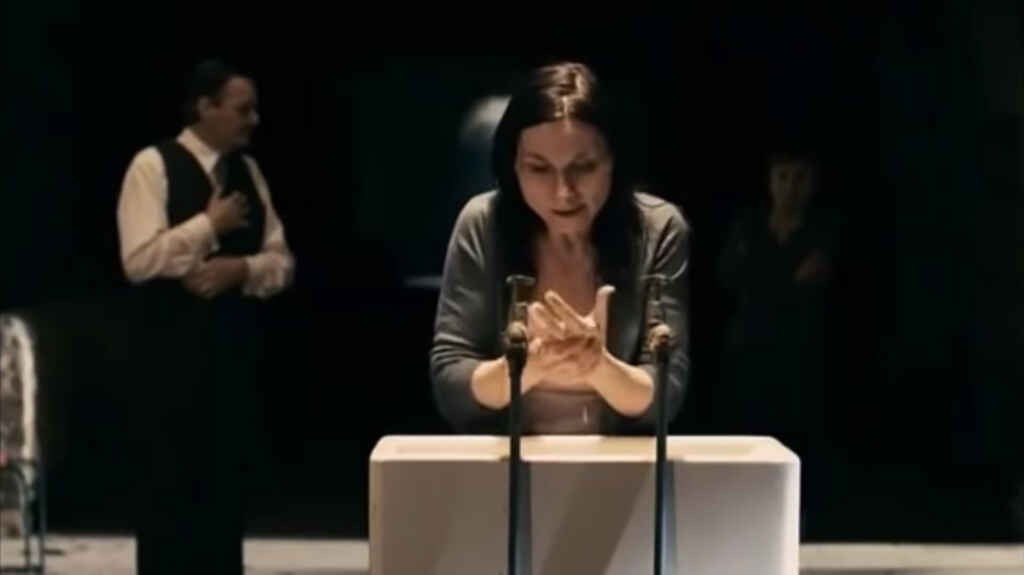 در یکی از به یادماندنیترین صحنههای مکبث، لیدی مکبث در حالی که در خواب راه میرود، فریاد میزند: "لکهی لعنتشده! برو بیرون!" او دستهایش را میشوید انگار که با خون آلوده شدهاند، در حالی که خودش کسی را نکشته است. این نماد خون، احساس گناه شدید لیدی مکبث را نشان میدهد. شکسپیر با نشان دادن سقوط او در یک پارانویای خونآلود، به جای اینکه به طور مستقیم بگوید او احساس گناه میکند، بسیار تاثیرگذارتر است .